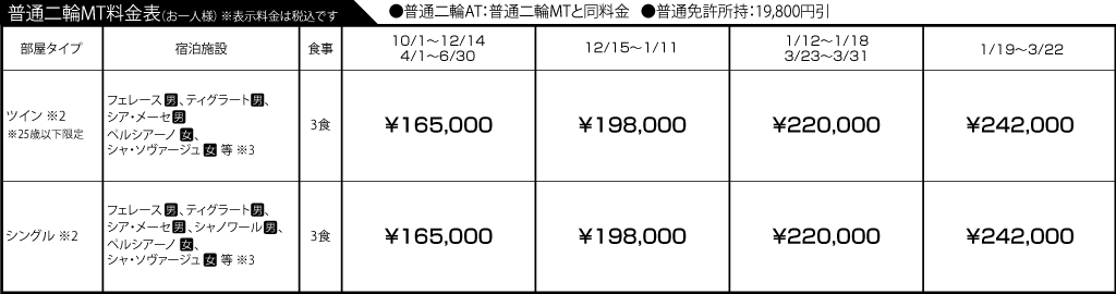 | 普通二輪MT | 普通車 | 月、水曜日 | 10日間 |